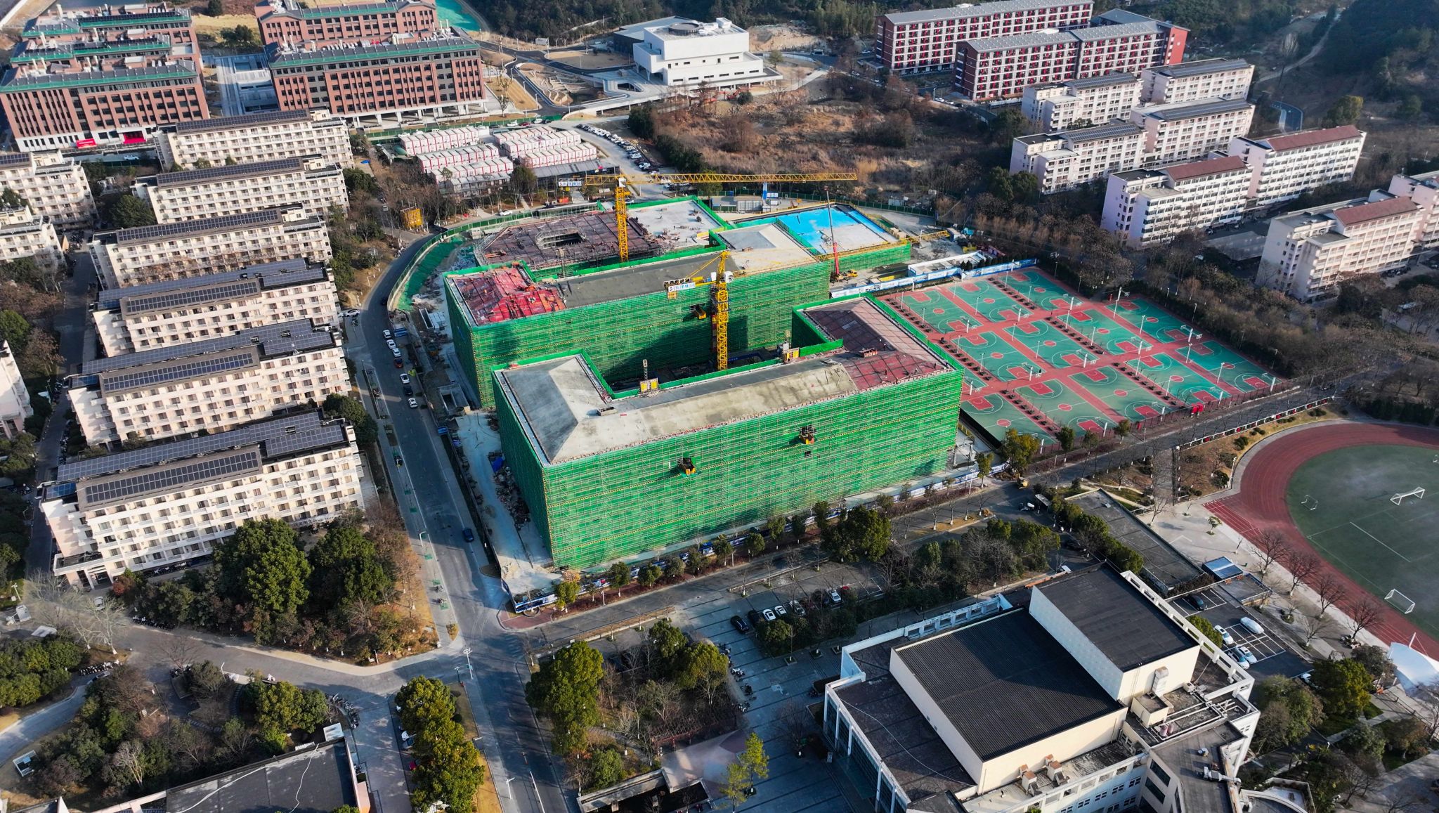 站在D區(qū)學生宿舍建設(shè)工程的屋頂向北看,100多米處正式剛剛投入使用的浙江新農(nóng)科教育教學中心大樓。浙江新農(nóng)科教育教學中心建設(shè)工程項目2024年10月25日竣工,總建筑面積62645平方米,其中地上建筑面積49995平方米,地下建筑面積12650平方米,總投資33165萬元。該項目是落實浙江省委省政府支持學校高水平大學建設(shè)的重要舉措之一,也是浙江農(nóng)林大學基礎(chǔ)設(shè)施提質(zhì)工程和推進高水平大學建設(shè)的重要組成部分。學校將根據(jù)新農(nóng)業(yè)、新鄉(xiāng)村、新農(nóng)民、新生態(tài)的發(fā)展需求,努力把新農(nóng)科教育教學中心建設(shè)成為集教育教學、科技創(chuàng)新、科普呈現(xiàn)為一體的浙江新農(nóng)科教育展示的“重要窗口”。