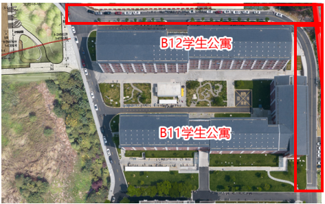 學(xué)生宿舍B12西面路口至學(xué)生宿舍B11東面路口,具體路段詳見(jiàn)下圖紅框區(qū)域。