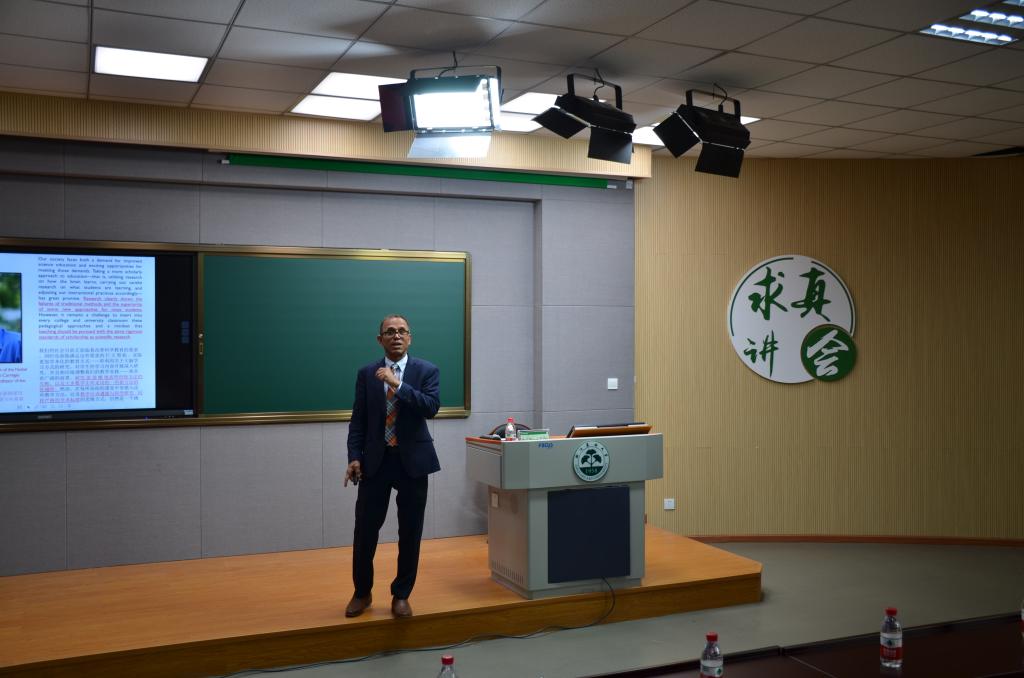 6月4日,美國(guó)伊利諾伊大學(xué)香檳分校農(nóng)學(xué)院副院長(zhǎng)、環(huán)境保護(hù)方面頂級(jí)專家PrasantaKalita教授做客第六期“求真講會(huì)”,作《創(chuàng)新教學(xué)和學(xué)習(xí)方法——為全球化勞動(dòng)力培養(yǎng)學(xué)生》專題報(bào)告。教務(wù)處、國(guó)際處、各學(xué)院(部)等部門(mén)、學(xué)院負(fù)責(zé)人和教師參加報(bào)告會(huì)。
