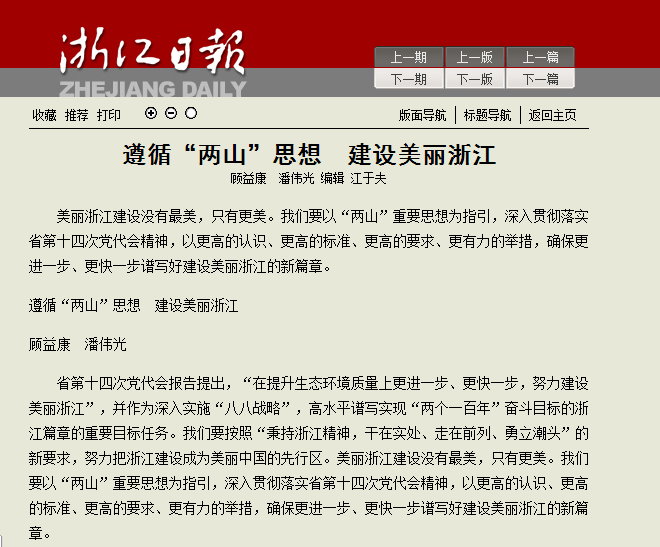 6月27日,《浙江日報》以大篇幅刊登我校中國農民發展研究中心理論文章《遵循“兩山”思想 建設美麗浙江》。