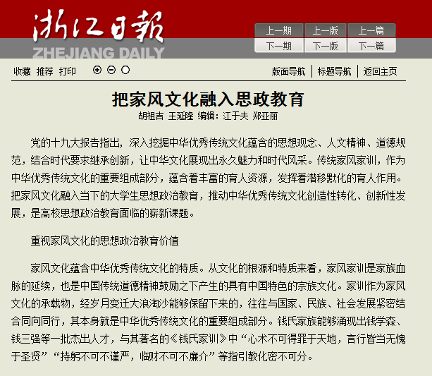 近日,《浙江日報》理論版刊登浙江省中國特色社會主義理論體系研究中心浙江農林大學研究基地教師胡祖吉、王延隆的理論文章《把家風文化融入思政教育》。