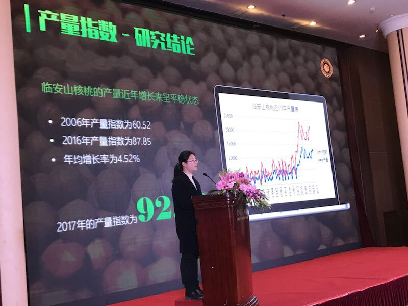 “中國山核桃看浙江,浙江山核桃看臨安?!?2月20日,由杭州市臨安區政府、中國食品工業協會堅果炒貨專業委員會共同主辦的中國臨安山核桃指數體系發布會在北京釣魚臺大酒店舉行。這一體系由杭州市臨安區林業局委托浙江農林大學組織編制,項目由信息工程學院的戴丹老師負責牽頭,團隊成員包括劉洪久、鄭劍(農業與食品學院)、胡彥蓉、周竹四位老師,以及十多位碩士研究生和本科生。