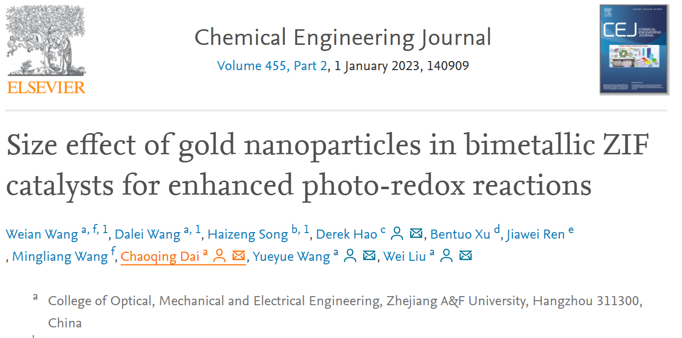 先進光電子應用基礎交叉研究中心戴朝卿教授團隊以“Size effect of gold nanoparticles in bimetallic ZIF catalysts for enhanced photo-redox reactions”為題于12月12日發表在工程技術領域國際期刊《Chemical Engineering Journal》上(中科院1區,IF=16.744)。這是先進光電子應用基礎交叉研究中心籌建以來,將光譜檢測應用于農林環境領域,實現工農交叉的重要成果。本文第一單位為浙江農林大學光機電工程學院,通信作者為德國馬普所洪堡學者郝強博士,浙江農林大學戴朝卿教授、王悅悅教授、劉威副教授。