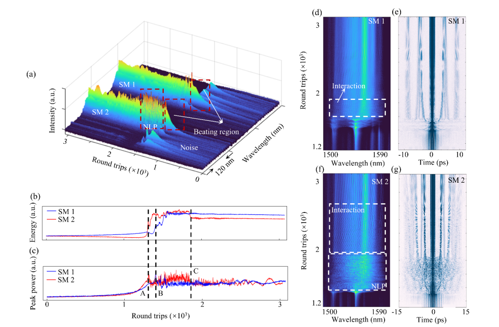 在現(xiàn)代光學(xué)和非線性光學(xué)領(lǐng)域,非線性孤子動(dòng)力學(xué)的研究具有重要的理論和應(yīng)用價(jià)值。特別是在高強(qiáng)度光場(chǎng)下,光學(xué)系統(tǒng)中的噪聲和強(qiáng)非線性效應(yīng)導(dǎo)致孤子行為的不可預(yù)測(cè)性,探索一種能夠在強(qiáng)非線性環(huán)境中穩(wěn)定存在的孤子構(gòu)建和切換機(jī)制,對(duì)于提升光學(xué)系統(tǒng)的性能具有重要意義。戴朝卿教授團(tuán)隊(duì)針對(duì)強(qiáng)光場(chǎng)環(huán)境下的孤子穩(wěn)定性,設(shè)計(jì)了一種新型的強(qiáng)非線性光學(xué)系統(tǒng),包括飽和吸收體金屬有機(jī)框架(MOF-253@Au)和極化控制器,揭示了孤子分子在復(fù)雜非線性系統(tǒng)中的動(dòng)態(tài)行為。研究發(fā)現(xiàn),強(qiáng)非線性下孤子分子為抵抗光學(xué)腔中的“湍流”,在建立階段會(huì)形成一種長(zhǎng)時(shí)間的類噪聲脈沖過渡態(tài)。通過極化誘導(dǎo),多脈沖態(tài)下由交叉相位調(diào)制效應(yīng)主導(dǎo)的孤子分子與類噪聲脈沖之間的切換機(jī)制也被剖析,主要涉及譜崩潰與振蕩以及噪聲態(tài)到自組織過程。理論上綜合分析了極化角度對(duì)孤子態(tài)周期性相變的影響,并準(zhǔn)確再現(xiàn)了實(shí)驗(yàn)中觀察到的構(gòu)建和切換機(jī)制。