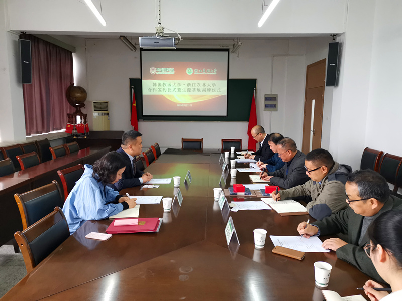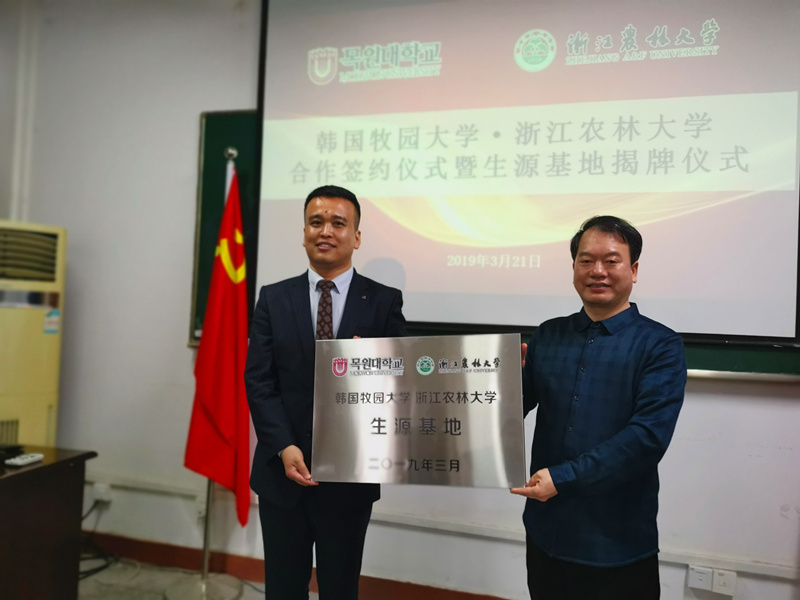 會上,文法學院院長王長金與邵敬勇院長簽署了具體的合作協議細則,學院黨委書記朱紅東為“韓國牧園大學·浙江農林大學生源基地”揭牌。