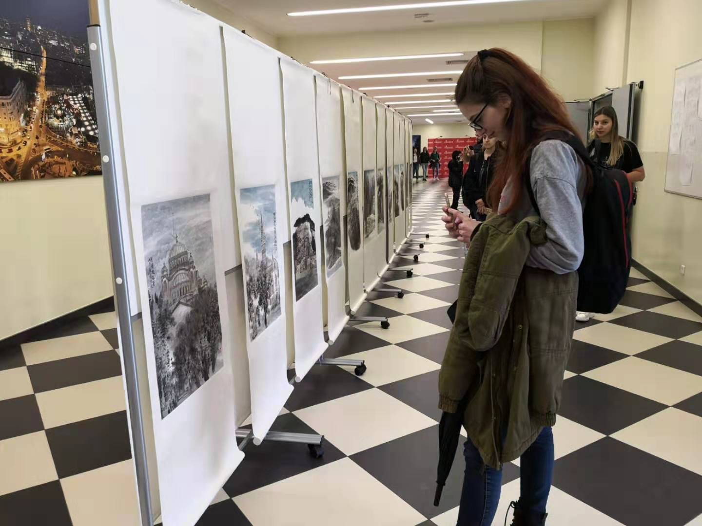 活動期間還舉行了“中國畫家筆下的塞爾維亞風光”畫展。觀眾們對中國水墨畫之美流連忘返,紛紛拿出手機拍照留念。當地主流媒體貝爾格萊德電視臺、沙巴茨電視臺進行了報道。