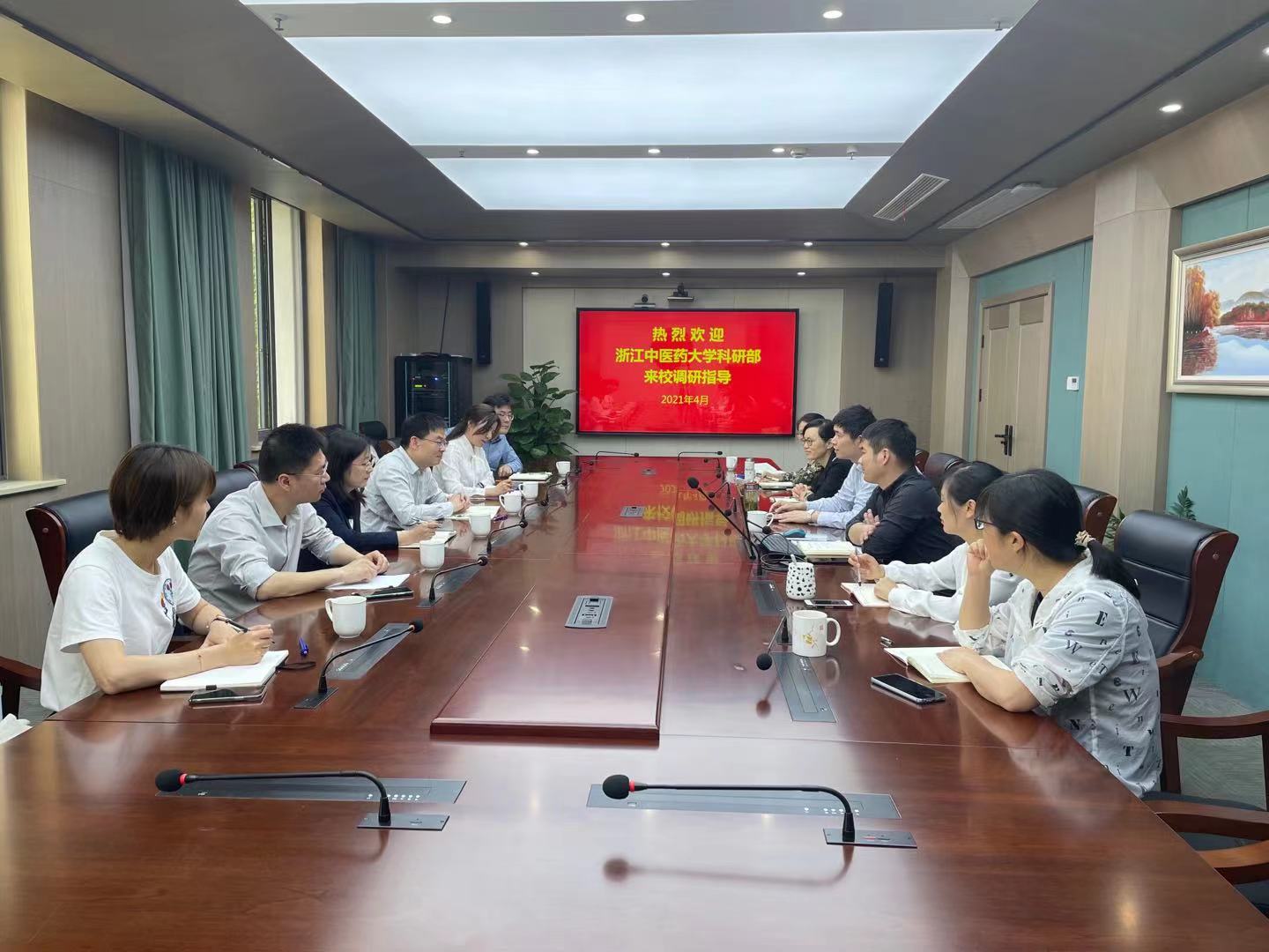 4月29日,浙江中醫(yī)藥大學科研部王輝常務副部長一行七人來校調研,科技處相關負責人及相關工作人員參加座談。